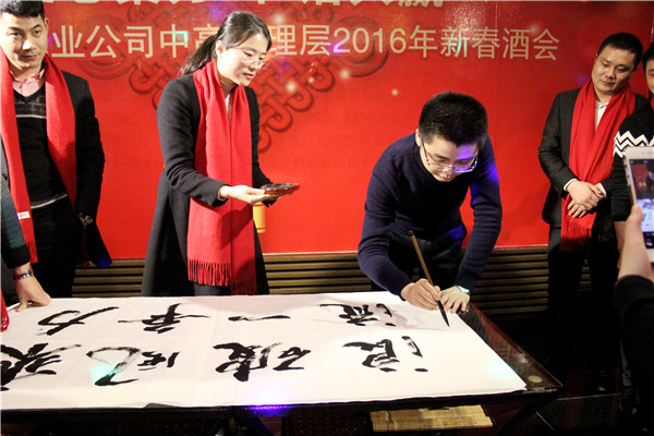 酒會上,雷鳴董事長作了重要講話,向全體中高管理層成員拜年,感謝全體成員一年來為公司發(fā)展辛苦的付出與努力,并希望新的一年大家共同努力,讓公司繼續(xù)大展宏圖、欣欣向榮。之后,各分公司、事業(yè)部、部門紛紛以創(chuàng)新、幽默、多樣的方式向全體參會人員拜年。生產(chǎn)制造中心以喜慶的春聯(lián)為依托,在表達(dá)新春祝福的同時,還帶來了印有“安全第一 質(zhì)量為本”字樣的員工集體簽名橫幅,為確保產(chǎn)品質(zhì)量作出承諾;凈水家電事業(yè)部總經(jīng)理王悅生的現(xiàn)場即興題字,用丹青妙筆表達(dá)了其部門成員奮勇爭先的目標(biāo)和信心;工程事業(yè)部總經(jīng)理劉東帶領(lǐng)其部門成員所采用的“三句半”拜年方式贏得了滿堂喝彩;財務(wù)部與企劃部共同合作的“異口同聲”有獎競猜創(chuàng)意拜年,更是傳達(dá)了“榮事達(dá)一家親”的美好寓意。