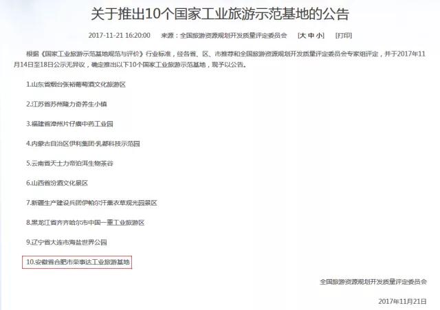 - 11月21日,全國旅游資源規(guī)劃開發(fā)質(zhì)量評定委員會(huì)發(fā)布公告,公布10個(gè)國家工業(yè)旅游示范基地,安徽省合肥市榮事達(dá)工業(yè)旅游基地成為安徽省唯一入選單位。
