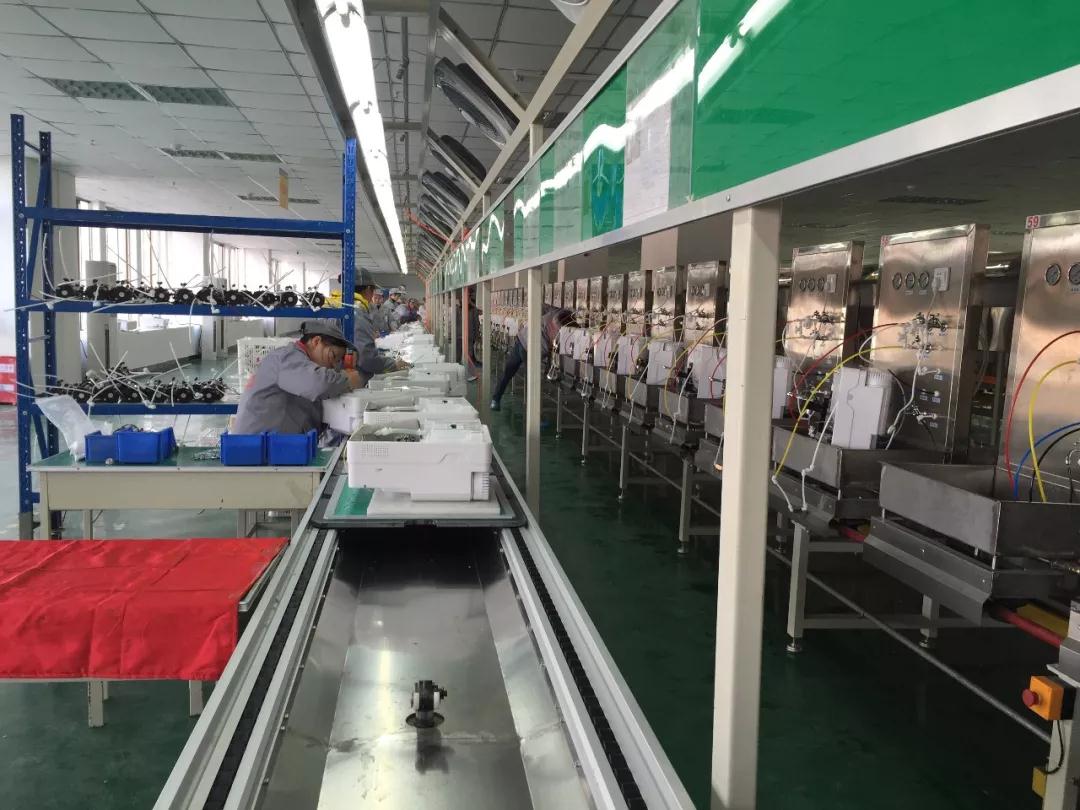 無(wú)塵車間內(nèi)配備的國(guó)內(nèi)先進(jìn)的凈水機(jī)自動(dòng)化生產(chǎn)線正處于工作狀態(tài),可編程控制器(PLC)自動(dòng)、轉(zhuǎn)向、垂直升降輸送產(chǎn)品;自動(dòng)倍速鏈輸送,節(jié)拍控制,大幅提高了生產(chǎn)效率。榮事達(dá)凈水器生產(chǎn)線日產(chǎn)能是一般生產(chǎn)線的3到4倍,在高速運(yùn)作的生產(chǎn)線上,工人們或迅速熟練地安裝產(chǎn)品零配件;或聚精會(huì)神地檢查儀表數(shù)值;或仔細(xì)認(rèn)真地核查包裝箱內(nèi)物品是否齊全,在注重生產(chǎn)效率的同時(shí)嚴(yán)把產(chǎn)品質(zhì)量關(guān),對(duì)每一個(gè)生產(chǎn)環(huán)節(jié)的操作都一絲不茍,力求實(shí)現(xiàn)產(chǎn)能、品質(zhì)的雙豐收。